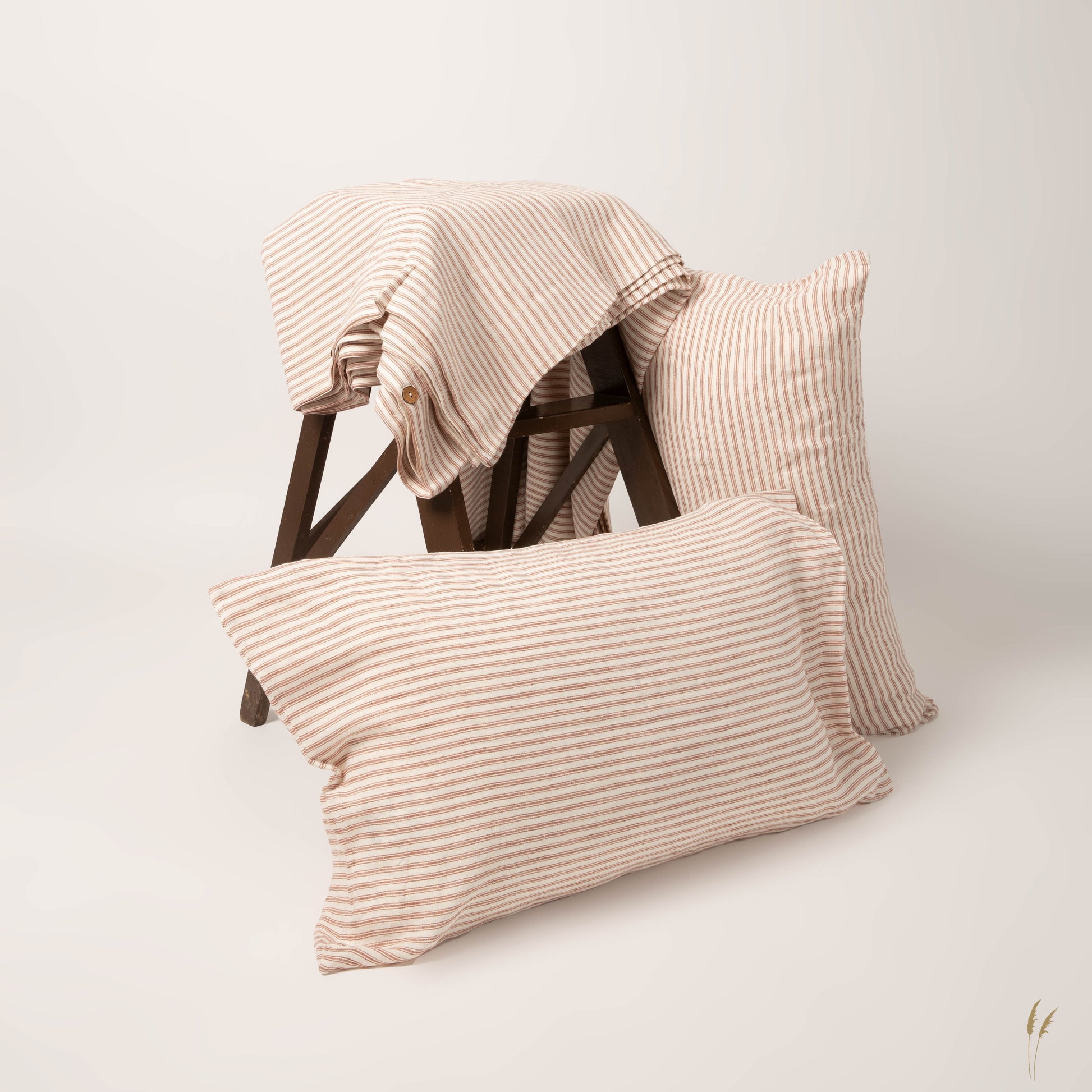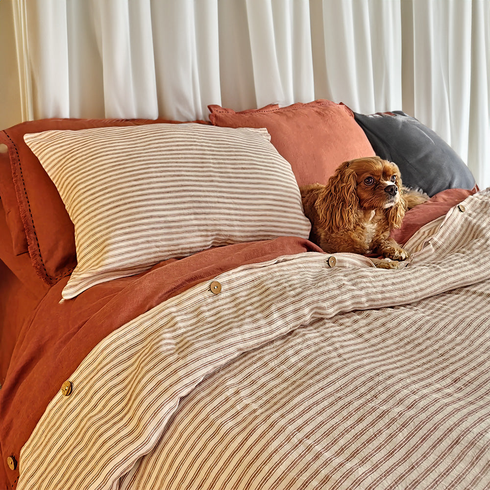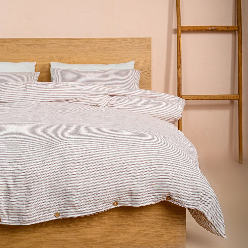 An everlasting style of pinstripes and breezy crimson red shade with the purity of European Linens and maximum softness. These handcrafted duvet covers are just perfect for your beautiful bed. Sleep peacefully with your loved ones on the two matching pillowcases secured with the coconut husk.'