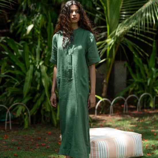 Elevate your wardrobe with the captivating allure of our Linen Dew Dress in Midnight Green. This short-sleeve linen piece effortlessly blends elegance and charm, featuring a refined mandarin collar and a flattering straight fit that harmonizes beautifully with your silhouette.