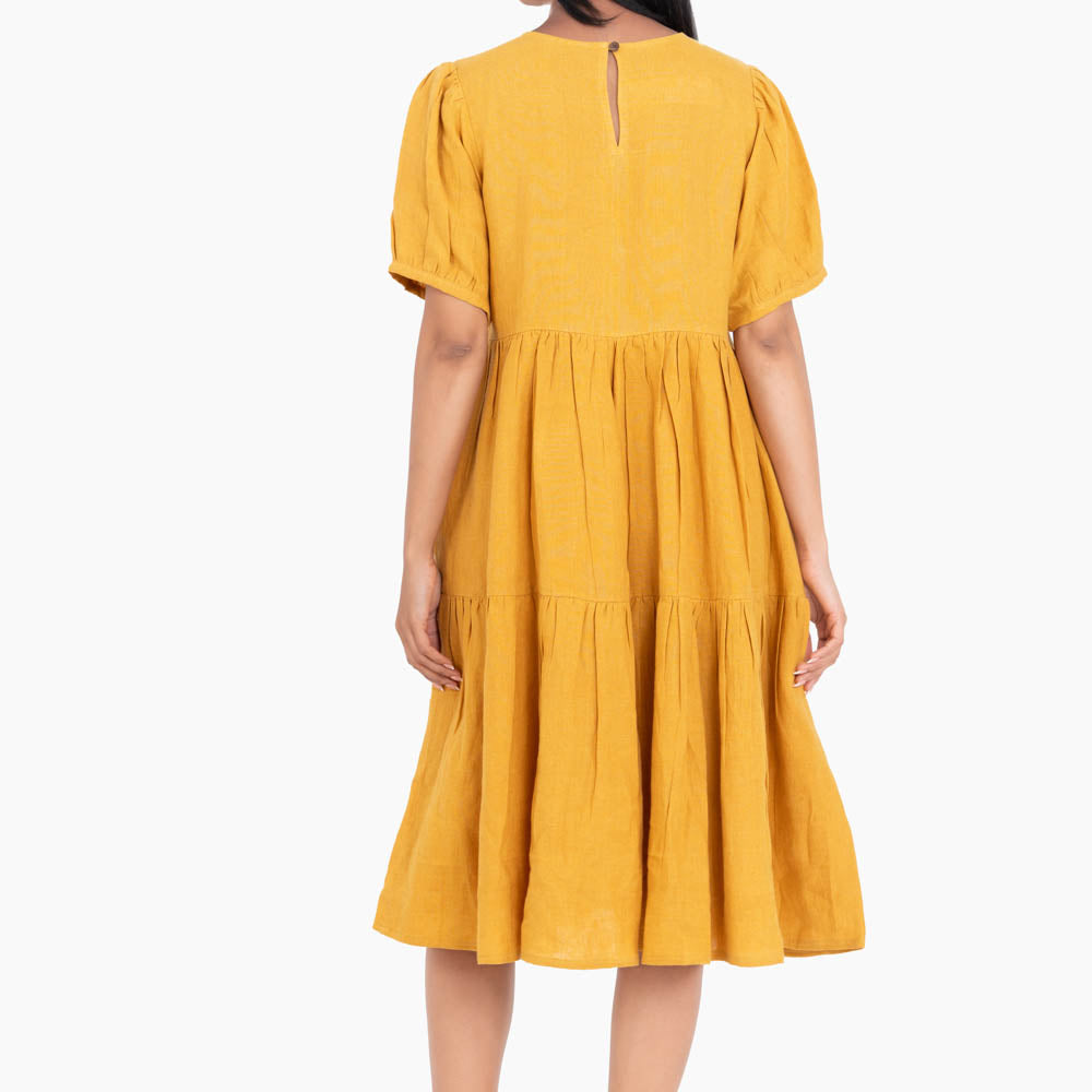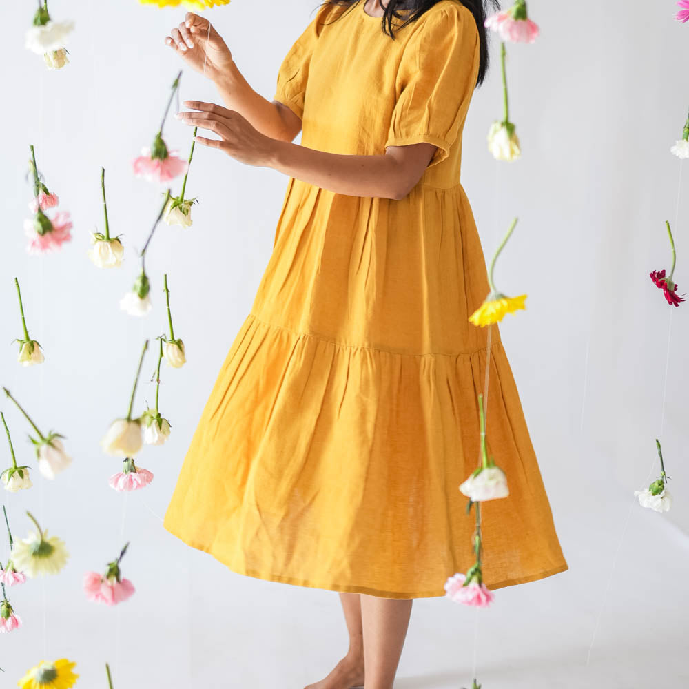Embrace the golden warmth of summer with our Ember Dress in Sunburnt Yellow. Made from 100% European linen, this dress effortlessly combines natural beauty with refined elegance. The airy, lightweight linen feels like a soft breeze on sun-soaked days, making it an essential addition to your summer wardrobe.
