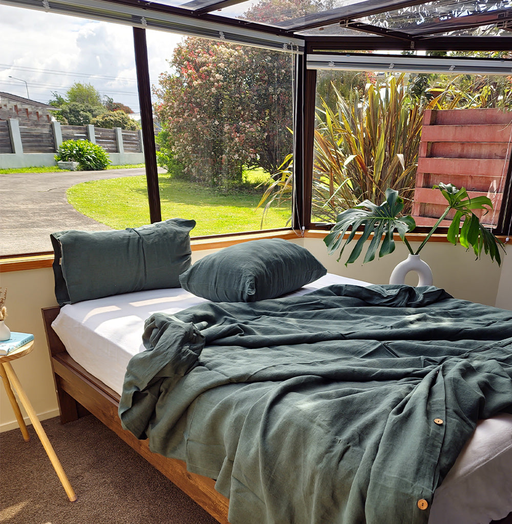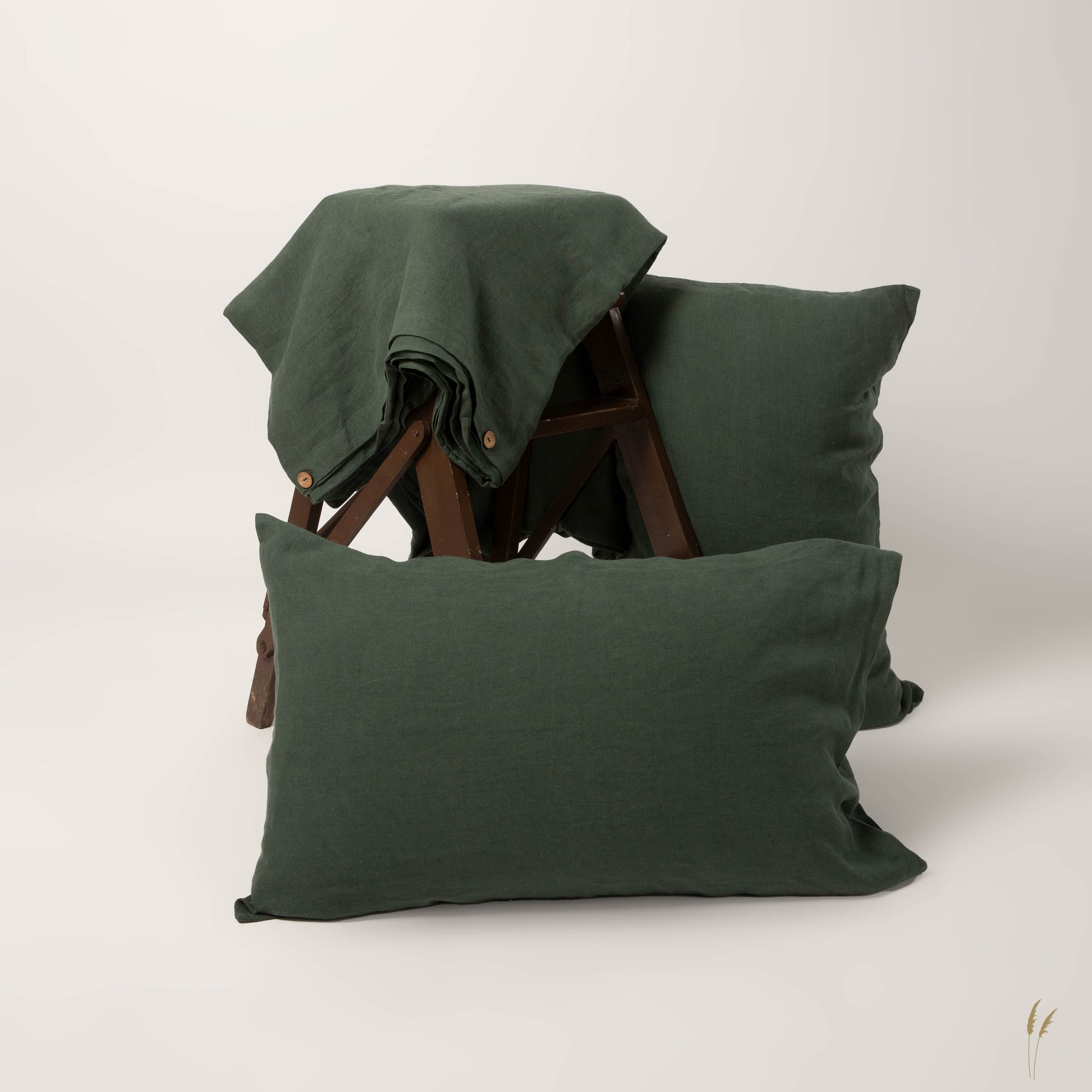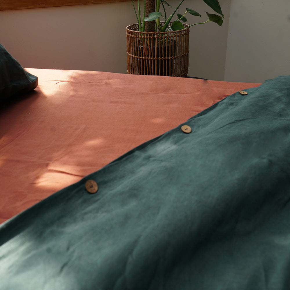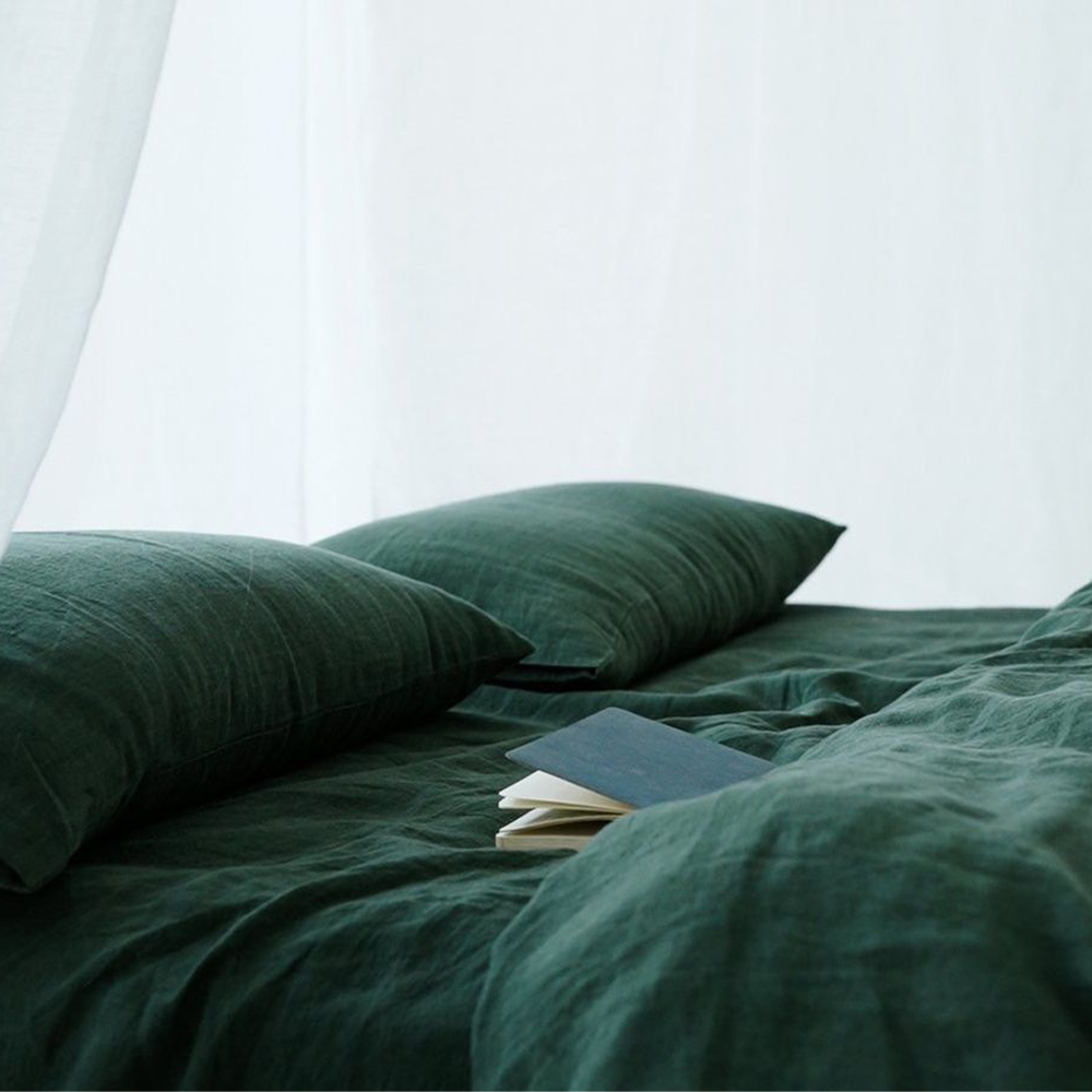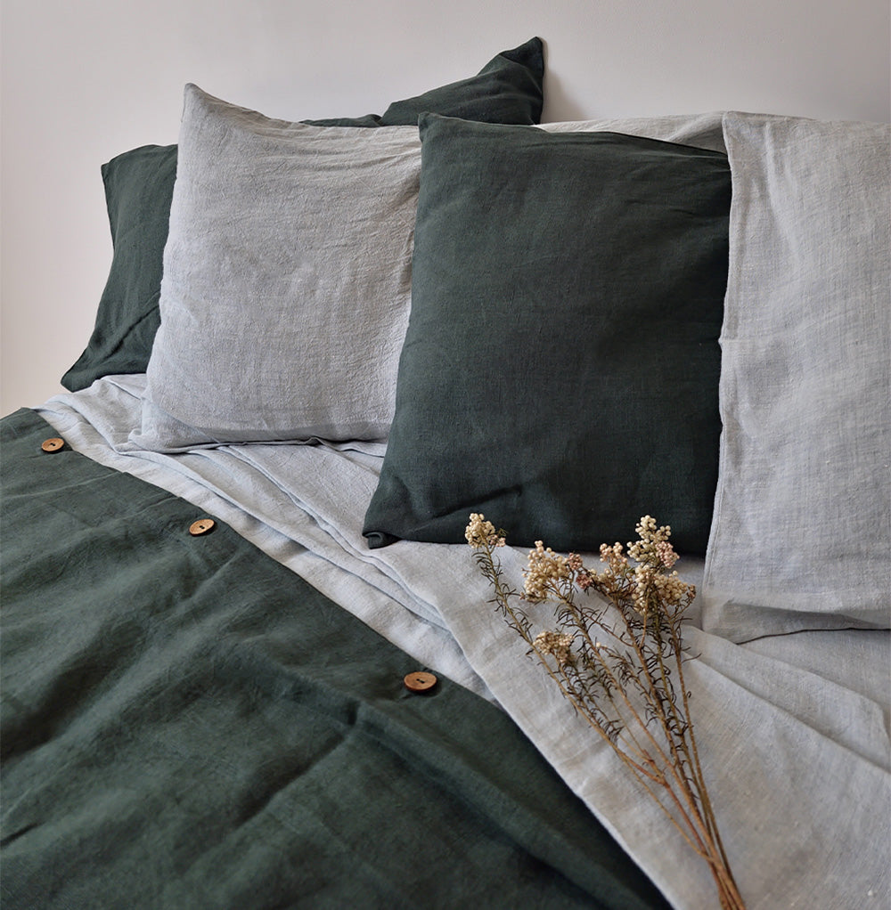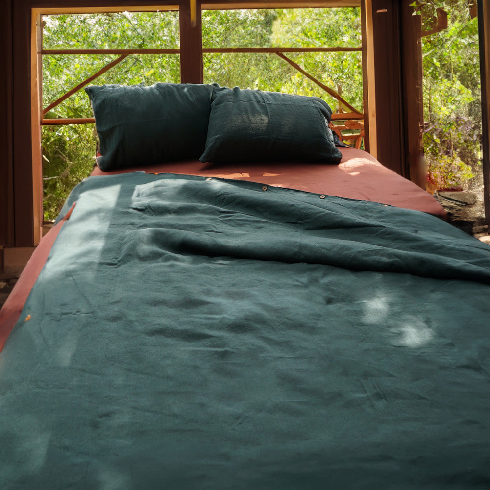Dive into forest hues with our Pinegrove Linen Duvet Set. This enchanting set not only includes a forest green duvet cover but also matching pillow shams, offering a complete experience of luxury for your sleep sanctuary.