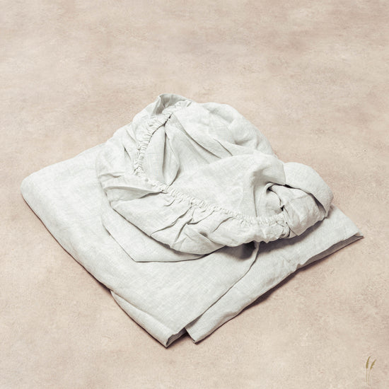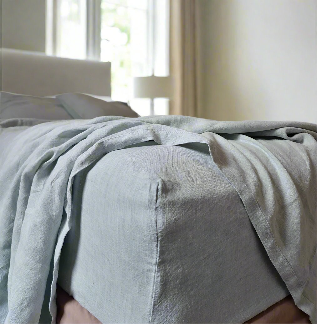 Bring freshness to your mattress with the Sky Blue Linen Fitted Sheet. The light blue hue enhances the premium linen fabric, providing a cool and breathable foundation for your sleep space.